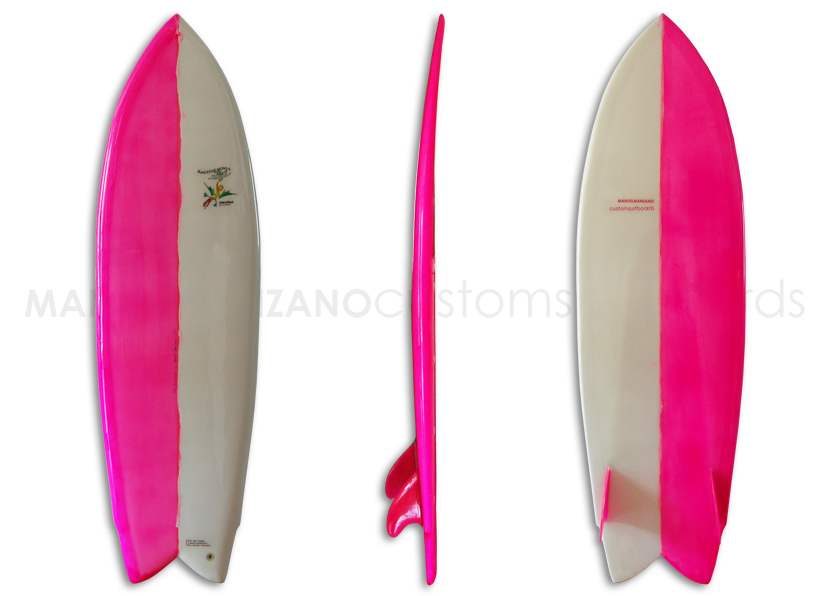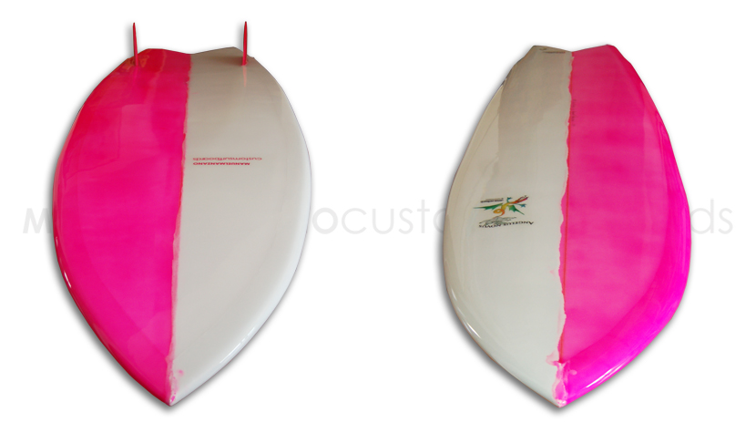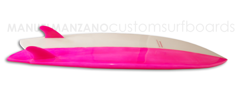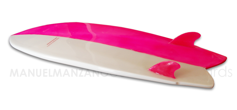 Quillas: twin-fin tipo keel, con quillas fijas de fibra pigmentada en rosa.
