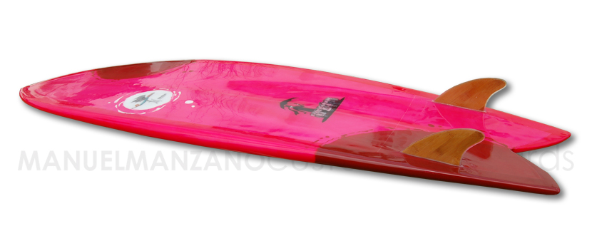 Esta twin-fin de tamaño 6'4'' la he construido para mí (este invierno he decidido ampliar mi quiver). Por tanto, qué decir de ella, realizada como me gustan las tablas: diseño y construcción clásica, mucho volumen, laminados y coats generosos sin miedo a que adquiera un poco más de peso, acabado gloss brillo, quillas fijas de madera, y por supuesto, decoración con resina tintada. En cuanto a esta decoración, he querido darle un estilo un poco fantasmagórico y rendir homenaje a uno de mis dibujantes favoritos: Edward Gorey, por lo que he incorporado alguno de sus dibujos en ella.
