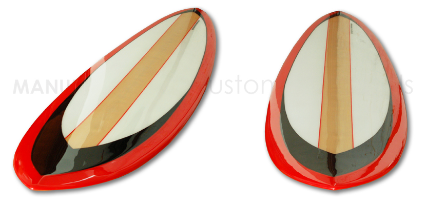 Volumen adelantado, con el punto de máxima anchura a más de 5 pulgadas respecto al centro de la tabla. Rocker no muy pronunciado (4''3/4 en nose y 2''1/2 en tail). Cola pintail. Cantos "pinched low" afilados (formando un deck curvo y concentrando el volumen en la zona central de la tabla), pasando a canto duro en arista en el último tercio. Bottom con un belly suave a rolled bottom en el tail. Arista en el nose para mantener el máximo volumen delante. Quilla fija de fibra, de tamaño 9'' con flex.
