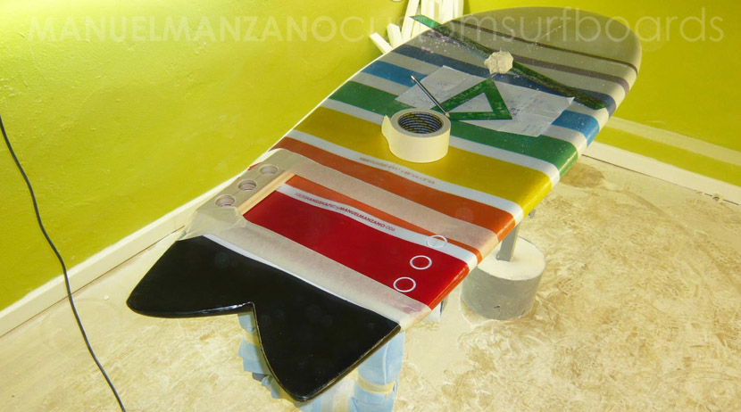 Con esta tabla pasé de la habitual decoración con pintura sobre el foam a la resina pigmentada. La experiencia fue tan positiva, que desde entonces, decoro todas mis tablas con esta técnica de tintar la resina. Paso a describir el proceso de laminado de la tabla: