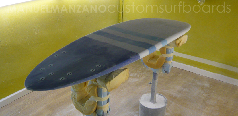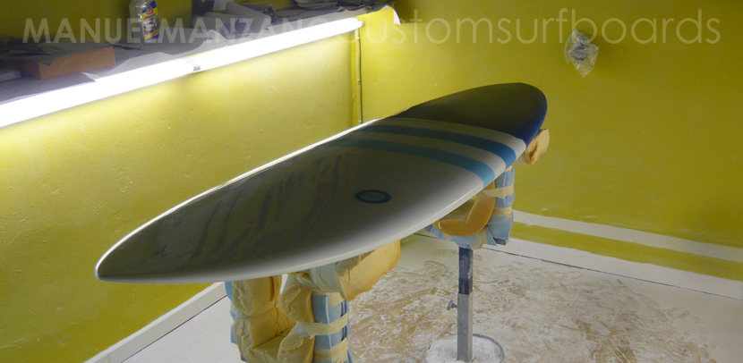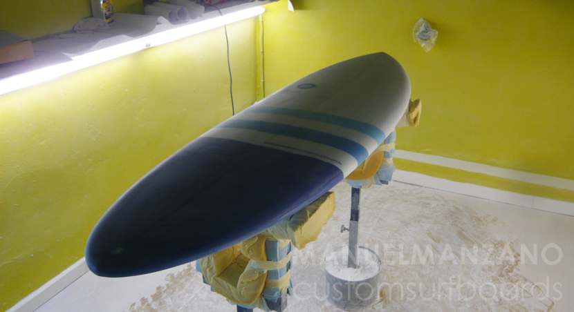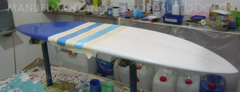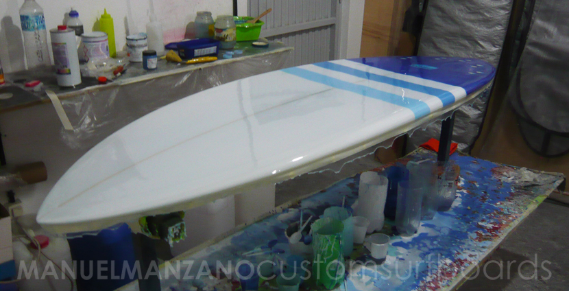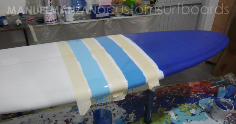 Sobre el laminado, se han pintado con reina dos franjas en tonos celestes.