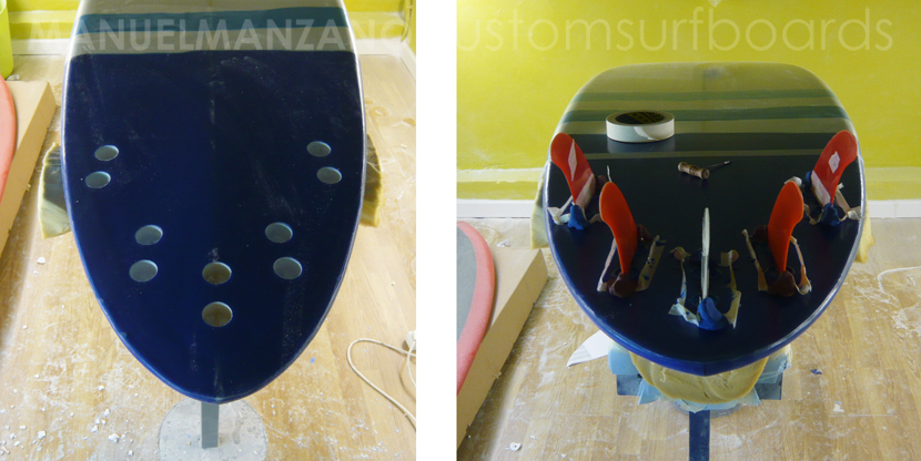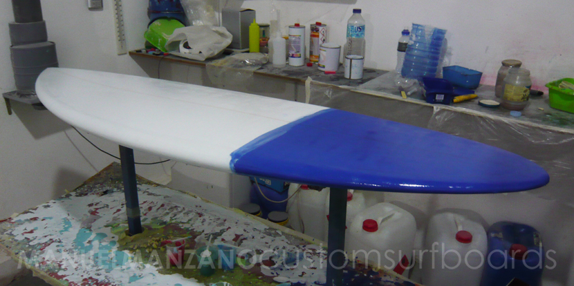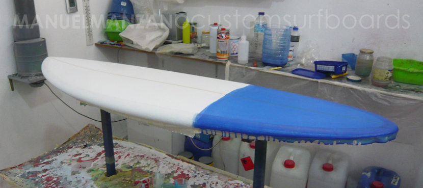 Laminado con fibra de 4oz. y resina tintada en blanco y azul.